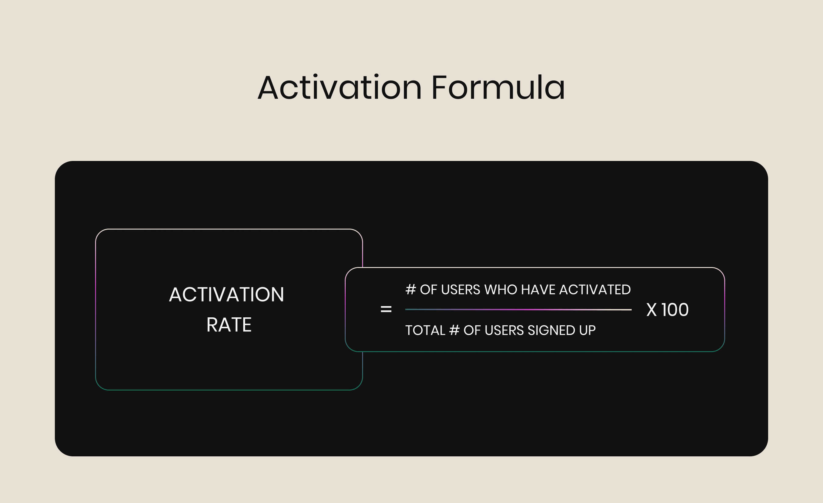 Activation is measured using the formula: (Number of activated users ÷ Total signups) × 100.