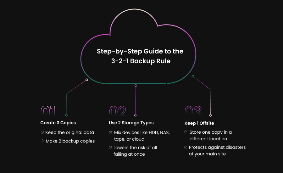 The 3-2-1 backup rule means keeping three copies of your data, storing them on two different types of media, and making sure one copy is offsite.