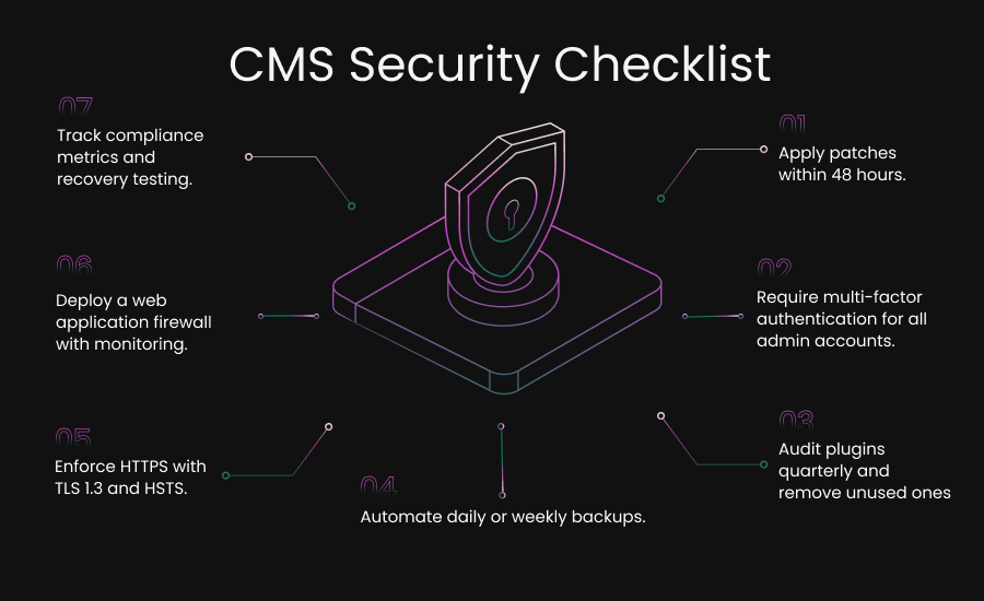 The damage from a CMS attack goes far beyond the technical. A hacked site can result in stolen customer information, reputational harm, financial losses, and even regulatory fines. Restoring trust after an incident is far more difficult than preventing one in the first place. That is why having a set of clear best practices is essential.