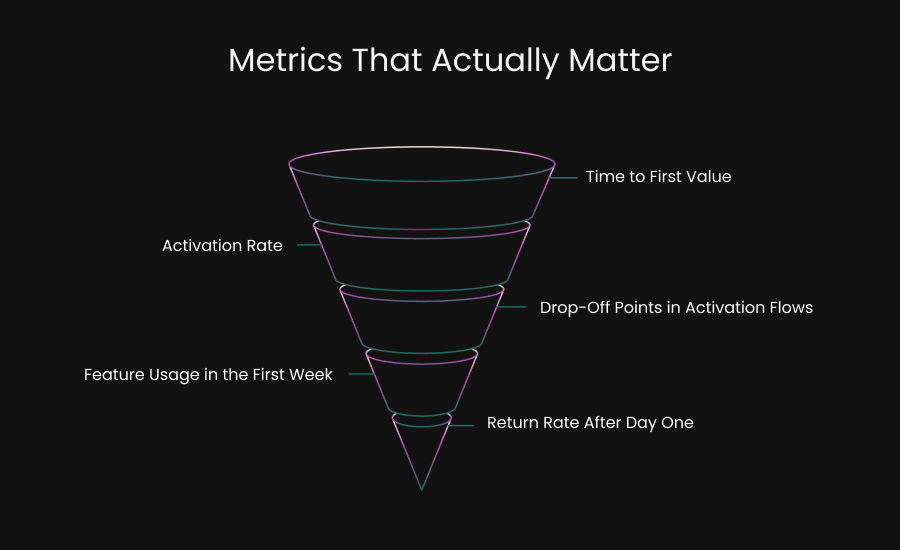 - Measuring behavior such as activation, return rate, and time to value matters more than tracking completion.